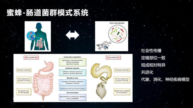 事实上,蜜蜂和人类的肠道菌群有许多相似之处。首先,它们都是通过社交生活传播的。例如,人们在出生后通过从母亲和环境中获得肠道菌,蜜蜂也是如此。它们是在羽化后通过社交行为和从蜂窝环境中获得的,它们的种植位置是一样的。如前所述,如果是人,主要种植在大肠。就是相当于蜜蜂的后肠,所以它们的种植位置是一样的,它们的相对构成也是比较特殊的,而且这些肠道菌都和宿主有一定的共同进化历史,所以蜜蜂也被用来研究肠道菌与宿主之间的关系,以及影响疾病发展的肠道菌模式动物。