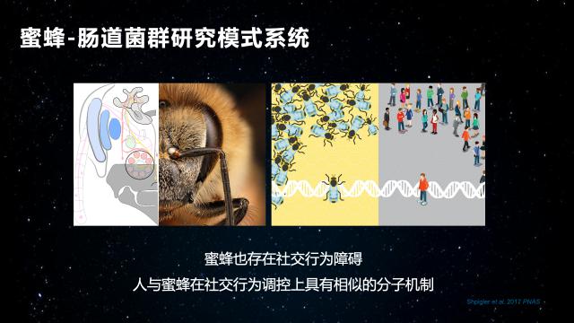 对于蜜蜂来说,因为它们是社会动物,它们也有这种社会行为障碍。科学家发现,它们是社会行为障碍蜜蜂,类似于人类抑郁症的调节基因通道。因此,这证明人类和蜜蜂实际上有相似的分子机制来调节社会行为,所以蜜蜂也可以用来研究肠道细菌对这种社会行为和神经紊乱模型的研究。