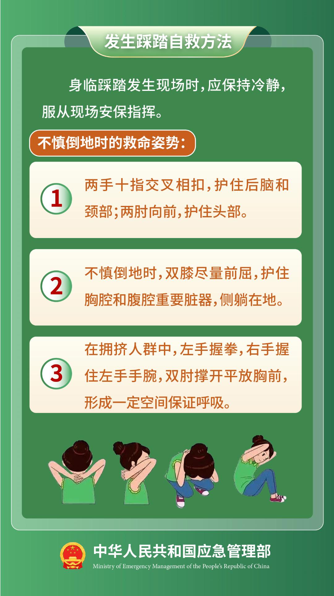踩踏紧急而危险,避险要冷静:人群密集不要惊慌,听安保指挥快速疏散!记住自我保护的姿势 —— 摔倒时十指交叉护颈,双肘护头;双膝前屈护胸腹,侧卧蜷缩成“安全世界”;人群中,左手握拳,左手握手腕,双肘撑开留有呼吸空间!