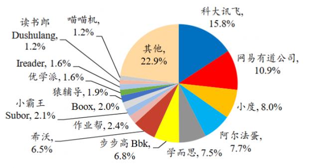 根据近几年天猫电子教育产品的市场份额数据,不难看出,科大讯飞(15.8%)在“全科辅导”赛道上、网易有道(10.9%)和学习与思考(7.5%)抢占约10.9% 1/3 的市场。