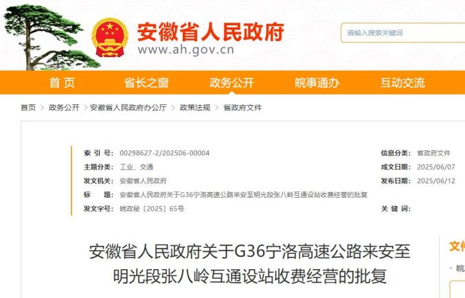 《关于G36宁洛高速公路安至明光段张八岭互通站收费请示》(皖交路路〔2025〕92号)悉。经过研究,现批准如下: