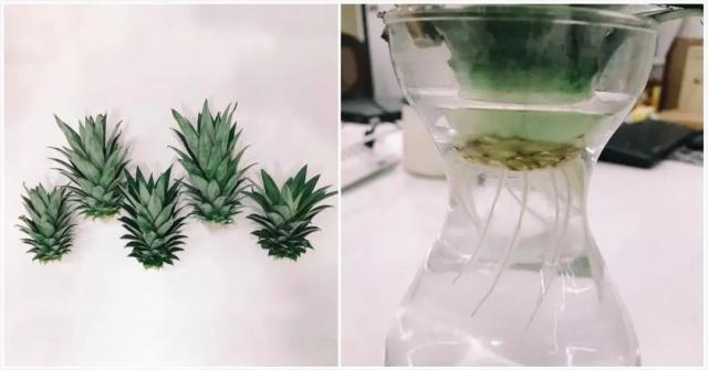 菠萝是一种聚花果,可食用的部分是许多花的发育成果和中心的花序轴。花序顶端的顶芽是菠萝头。切下糖分多,容易变质的部分后,浸泡在水中。每天换水可以长根。根系结实后,可以移植到花盆中,给予适当的温度和光照条件,健康生长甚至开花结果。