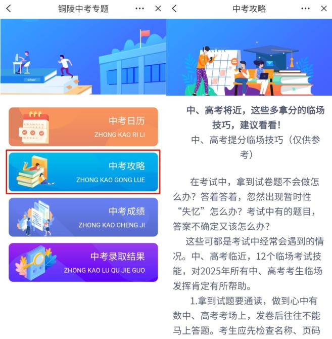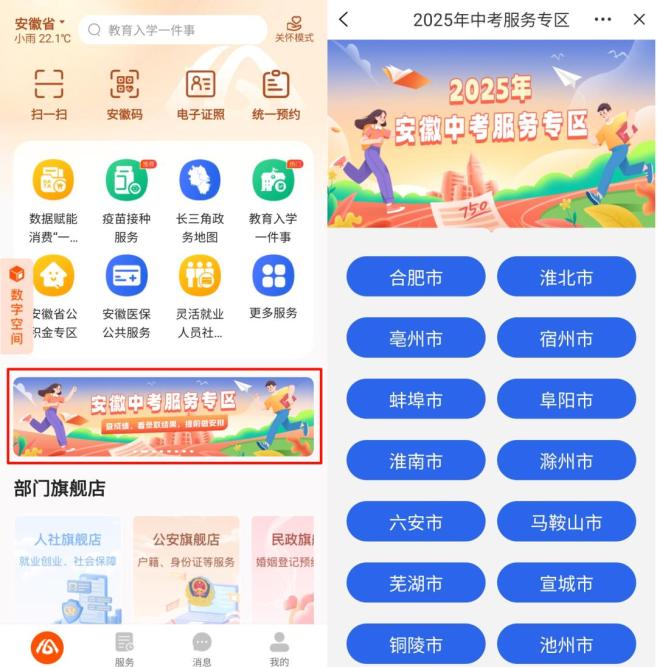 登陆“皖事通”APP,点击首页中考区域轮播图或在搜索框中输入关键词“中考”进入2025年安徽省中考服务区,即可使用快速查询、申请指南、中考日历等便捷服务。