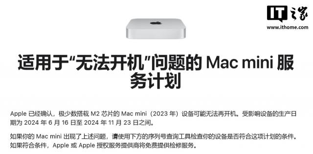 IT 世家 6 月 14 今天苹果公司(66 月 13 日本)发布博文,针对存在“无法开机”的问题 M2 Mac mini 设备,启动新的服务计划,受影响的用户可以免费维修设备。