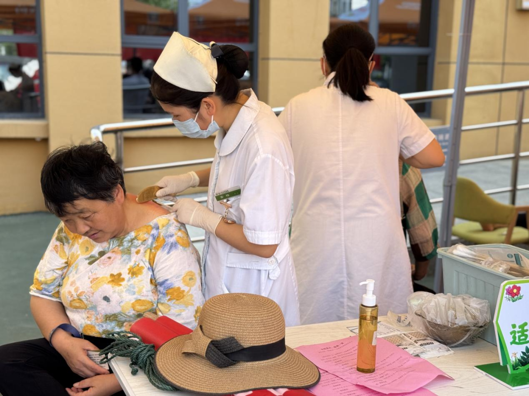 体检区,居民们有序排队,场面热闹而温馨。在开展基础健康咨询服务的同时,市中医院的医务人员对居民进行了详细的血压、血糖等免费测量。医师还为前来咨询的居民建立了个性化的医疗档案,针对疾病防治、日常保健等问题,耐心地用通俗易懂的语言解答疑惑。特色中医项目,如刮痧、扎针、耳穴点豆等,深受居民欢迎。一位长期饱受腿部疾病困扰的居民,在经历了艾灸治疗后,脸上露出满意的笑容,不停地向医护志愿者竖起大拇指表示感谢。