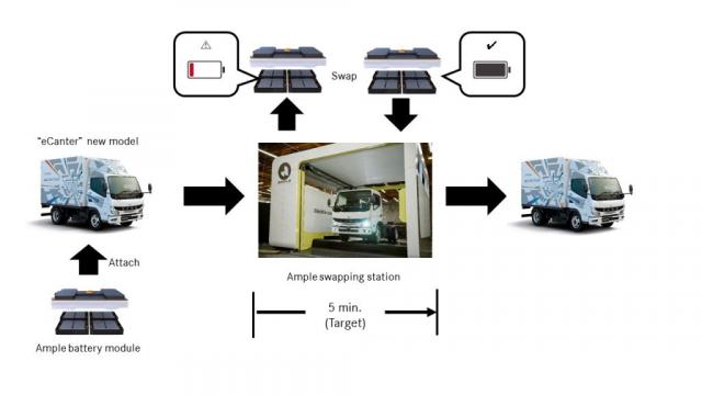 以三菱 eCanter 举例来说,根据扶桑的介绍,这辆车如果用交流电充电需要一整夜才能充满,即使使用DC快充也需要一到两个小时。三菱、三菱扶桑和三菱扶桑 Ample 联合试点旨在通过换电解决这一长期停机问题,在几分钟内恢复全电状态,大大提高车辆出勤率。同时,该技术还可以构建储能基础设施。当自然灾害发生时,为电网提供紧急电力,在日本,这也是三菱长期以来的战略焦点。