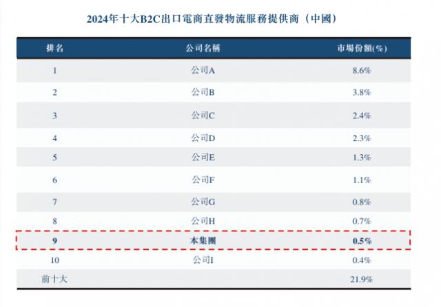 根据弗若斯特沙利文的信息, 2024 年收入计,中国 B2C 直接出口电子商务物流服务的市场规模约为人民币 2878 亿元,约 5000 参与中国的名服供应商 B2C 直接出口电子商务物流服务市场的竞争 2024 年度收益计,前 10 参与者只占总市场份额的比例 21.9%。