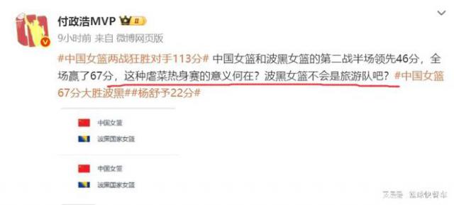 经过两场比赛,中国队总比分进球,一场胜利。 46 分数,另外一场胜利 67 分数,两战整整赢得对手。 113 分,这绝对是亚洲梦之队的实力。但是对于中国队这样的胜利,却有专家提出异议,在他看来,中国队能够连战连捷,主要是因为对手实力太弱。“中国女篮和波黑女篮在半场领先对手。 46 分数,整场比赛都赢了 67 分,这种虐菜友谊赛的意义何在?波黑女篮不是旅游队吗?”这位专家对此表示怀疑。