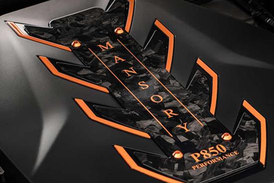 在外观上,新车增强了大量的碳纤维材料,包括发动机舱盖、前格栅、前格栅、 / 后围和侧裙,以岩层纹理设计和橙色元素为装饰,看起来极其个性化。在汽车的后部,后围配有一个很大的底部扩散器,三个露出的排气位于中心,非常粗壮。此外,超小型双尾设计也有设计感,进一步优化了空气动力学性能。