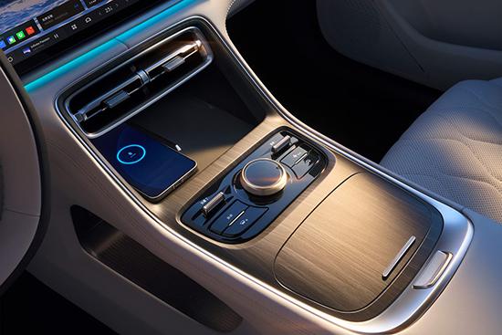 内饰方面,吉利银河 A7 整体布局简单,全液晶仪表和中控面板采用悬挂式设计,两辐方向盘组合,充满科技感。细节方面,岛台区域保留了一些功能的物理按钮,并配备了手机的无线充电板。