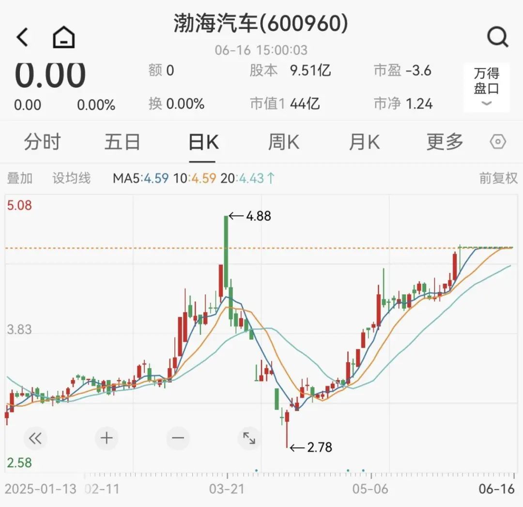 渤海汽车股价截至5月30日收于4.59元/股,总市值44亿元。