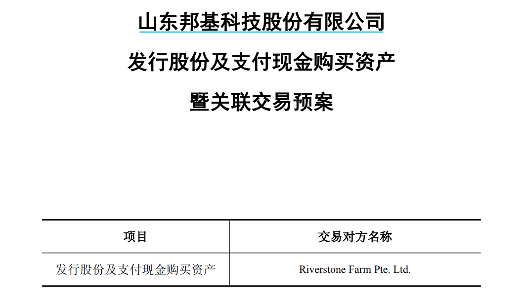 六月十六日,邦基科技宣布,该公司拟通过发行股份和支付现金的方式,向Riverstoner FarmPte.Ltd.购买其持有的北溪农牧、瑞东伟力、鑫牧、瑞东农牧(利津)、瑞东农牧(山东)、威力牧业(滨州)股权100%,派斯东股份80%。