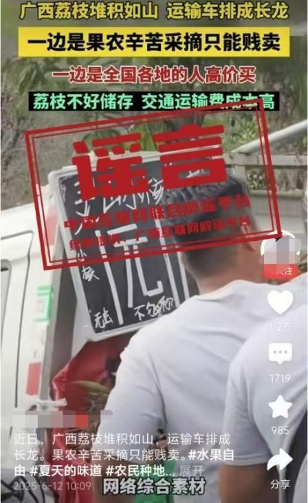 事实:六月十二日,网爆“近日广西荔技堆积成山,运输车排起了长队。影片显示荔技沉积和“灵山荔技1元”字样,果农辛苦收获只能便宜卖。经过核实,视频内容并非发生在灵山县。目前,灵山荔技“妃子笑”等中熟品种逐步批量上市,大规模上市日期为6月20日左右。目前荔技产销有序进行,没有发现“荔枝滞销廉价销售”、“采收堆积成山”、“运输车排成长队”等个别媒体报道,也没有发现价格低至1元的荔技销售。(来源:“广西网络违法不良信息举报”微信公众号)