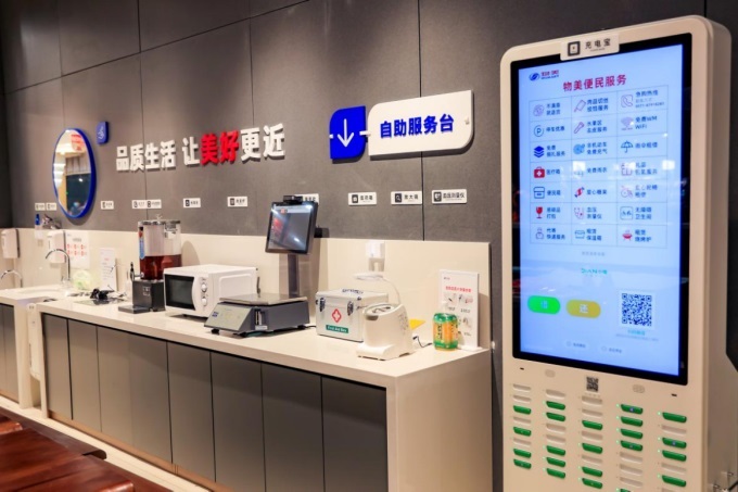 在服务设施方面,门店入口设有“一站式便民服务区”,包括自助茶饮机、应急药箱、共享雨伞、免费加热商品等服务。休息区配备了基本的健康检测设备,包括血压计和身高体重测量仪,体现了更人性化的操作理念。