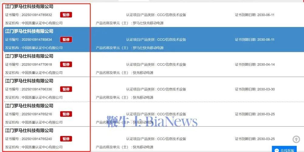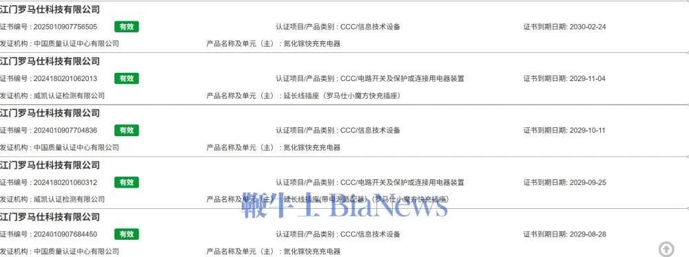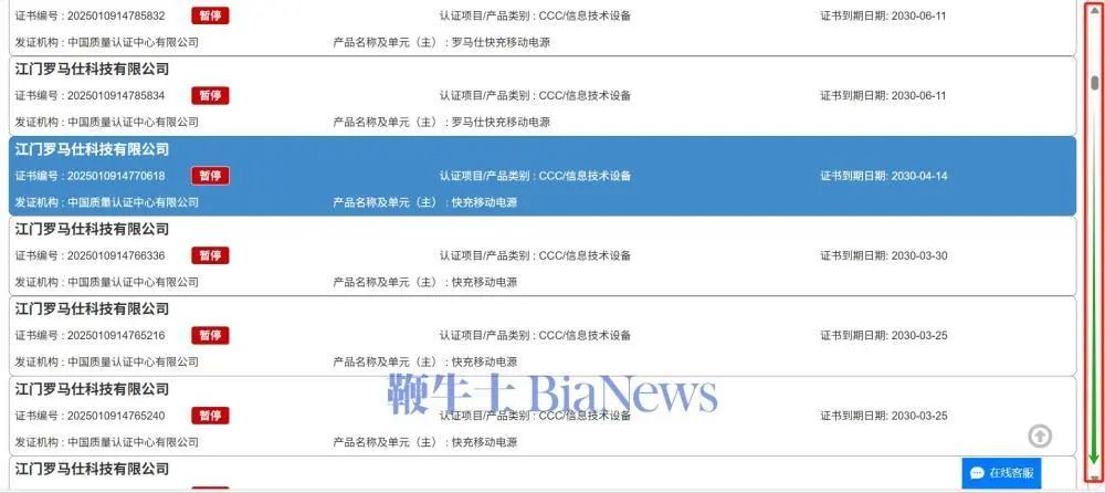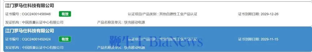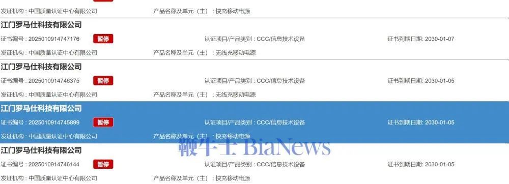 几乎所有罗马仕科技相关公司的快充移动电源3C认证都被撤销了。