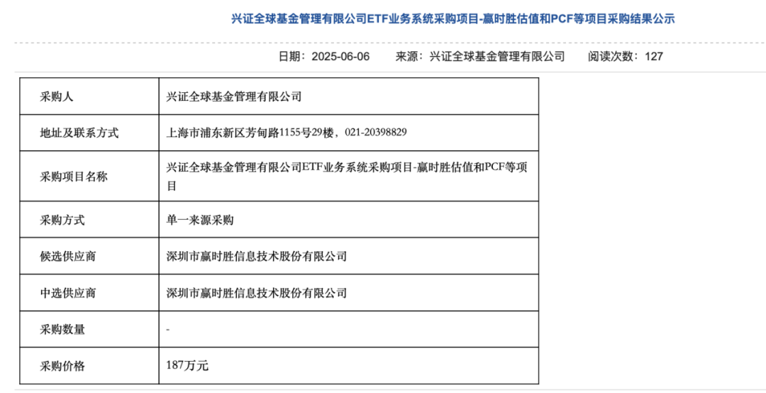 进入ETF市场信号,兴证全球基金披露一单ETF业务系统采购项目