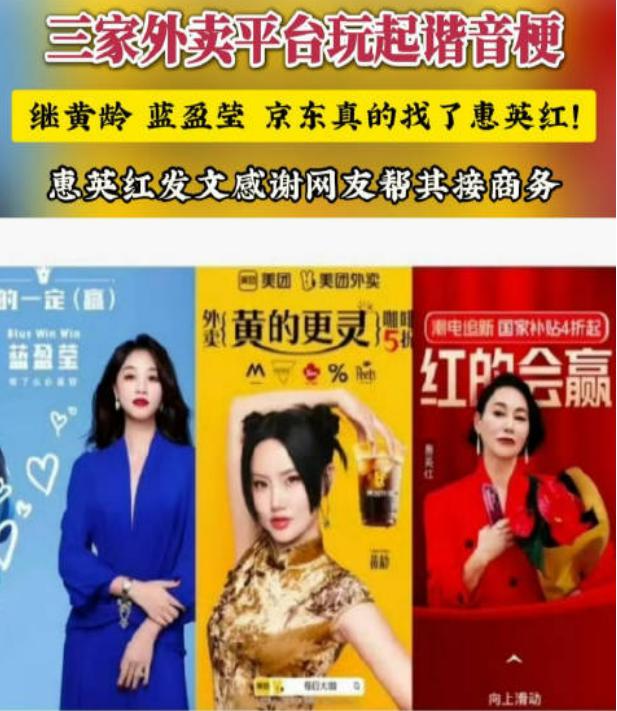 与以往代言人邀请实力派或偶像派不同,代言人的选择完全依赖于谐音梗。美团邀请黄龄代言,口号“黄更灵”。如果你饿了,你会立即邀请蓝盈莹代言。口号是“蓝一定会赢”,JD.COM也邀请惠英红代言,口号是“红一定会赢”。
