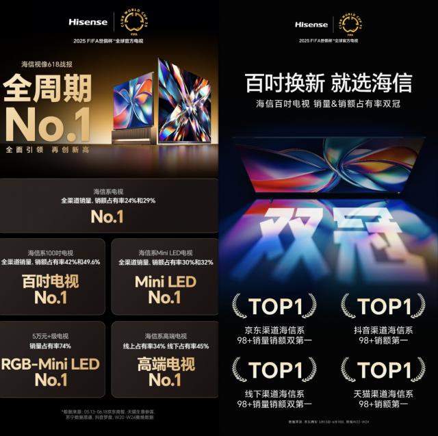 最新发布的海信视频 618 战况表明,在流行的百寸时尚中,海信凭借出色的画质和电影游戏产品体验,充分激发了消费者的换新热情。 42% 销售比例和销售比例 49.6% 销售比例,位居百寸电视品类第一。“百寸换新,选海信”这一概念,已牢牢占据了消费者的心智。