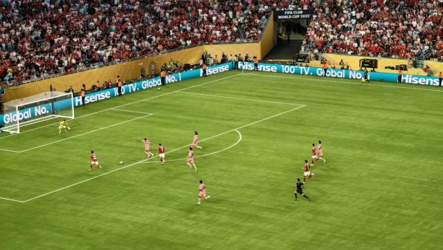 从比赛传播到比赛裁判,再到体育场管理再到观众互动,科技在今天的体育比赛中发挥着极其重要的作用,这次世俱杯成为了一场展示技术的表演。海信围挡广告作为世俱杯首个全球官方合作伙伴,如约亮相赛场。"海信 100 “寸电视,世界第一” RGB-Mini LED 电视台的广告语言,再一次与“世界球王”梅西等国际巨星相遇。