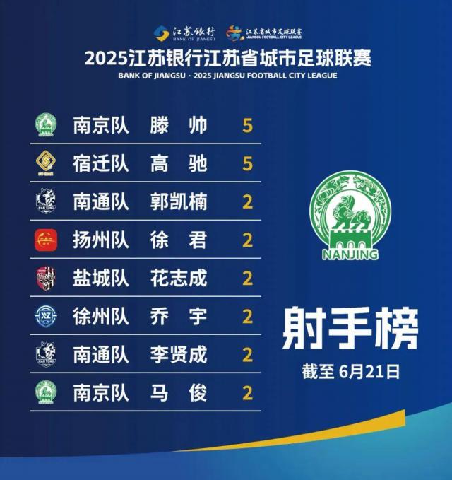 此役,南京队 10 号码球员滕帅上演帽子戏法,加上之前打进的球员。 2 球,以 5 球队和宿迁队高驰一起位居射手榜榜首。然而,滕帅 5 球队都是在运动战中进球,高驰有 1 粒点球,滕帅因此登上了苏超射手榜。