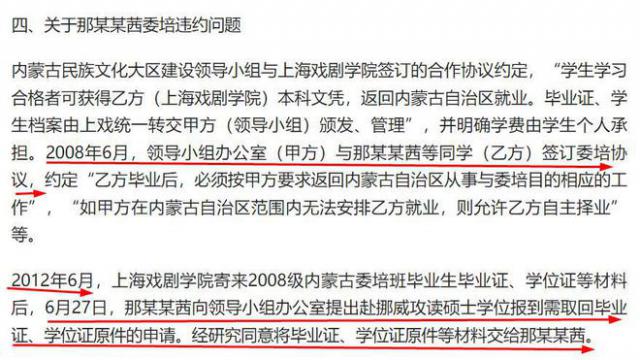 通报写道 2008 年 6 月内蒙古民族文化大区建设领导小组与那尔那茜签订了委托培训协议。根据协议,那尔那茜将在上海戏剧学院完成学业后返回内蒙古,从事与委托培训目的相应的工作。