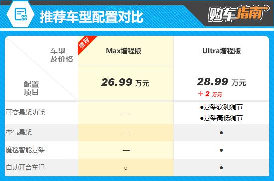 前面提到的增程版车型中 Max 增程版是非常值得推荐的选择。推荐型号与高配型号相比,主要缺少空气悬架,不支持悬架软硬高低调节,也不配备魔毯智能悬架。但是考虑到自己已经有了很好的舒适度,对日常使用影响不大。另外,高配车型增加的自动开闭门并非所有车辆场景都适用,接受程度因人而异。综合设备差异与 2 一万元的差价,Max 增程版无疑是更具性价比的选择,尤其适合家庭用户。