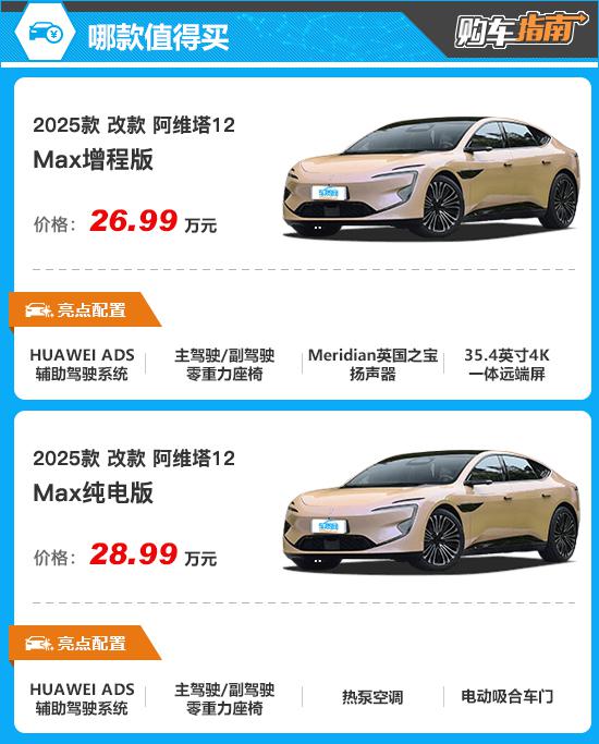 阿维塔拥有高度原创的设计、豪华的配置和华为的技术加持。 12 自上市以来,吸引了不少用户的目光。伴随着增程版车型的推出,其购车门槛逐渐降低,客户覆盖面不断扩大。近日,2025 阿维塔的改款 12 正式上市,对配置进行了多次提升,产品实力再次提升。所以,面对这个新车客户该如何选择呢?本期《购车指南》将为您详细分析。