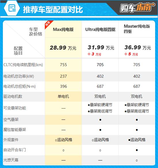 纯电动汽车中,Max 纯电动版也是非常值得推荐的选择。类似于增程版,推荐车型在悬架配置上略逊于两款高端车型,不支持空气悬架及相关调节功能,也没有配置自动开闭门。另外,虽然动力性能稍弱,但是它的动力性能 755km 的 CLTC 在整个系统中,纯电续航里程最长,补能频率也较低,更适合大多数家庭用户。除了上述差异外,推荐车型与高配车型相比。 Master 纯电四驱还缺少运动风格的外观套件,虽然在视觉效果上略有差距,但考虑到 5 一万元的差价,仍然具有较高的性价比。