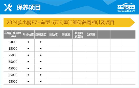 2024 款小鹏 P7 整车质量保证为五年或五年 12 三电系统质保政策为八年或八年(以先到为准), 16 万公里(以先到为准)。另外,限量版 Max 第一个非营运车主终身质保车型电池组质保(免责条款以官方为准)。保养方面,5000 第一次检查车辆需要在公里内进行,包括制动系统、轮胎、线路、电动驱动系统、动力电池等。,并更换空调滤芯,以便后续。 10000 公里或 1 每年一次(以先到为准)。制动油、电驱动系统、冷冻液等特点都需要 80000 公里或 4 每年(以先到为准)进行维护。
