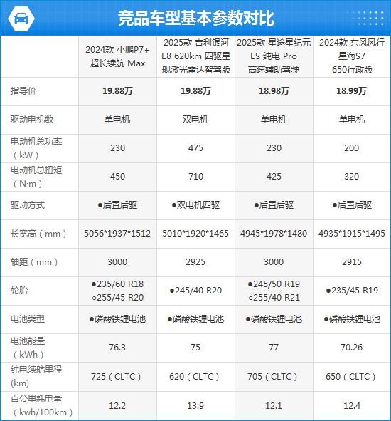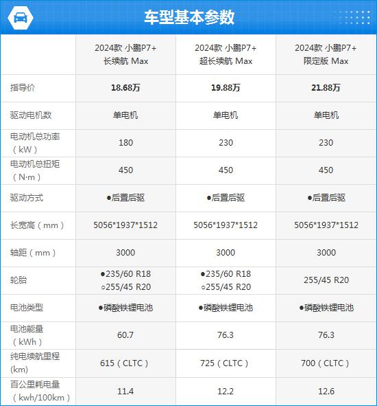 2024 款小鹏 P7 配备后置单电机,根据车型配置的不同,总功率可分为 180kW 和 230kW 两者,总扭距均为 450N · m。CLTC 根据车型版本的不同,纯电续航里程分为 725km/700km/615km/700km 三种。