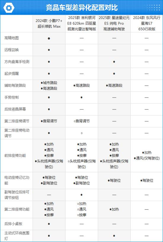 相对于竞品车型,2024 款小鹏 P7 它的优点是智能配置,提供高精度地图、远程召唤、城市道路辅助驾驶、主动围绕氛围灯等功能,让用户拥有更前瞻性的智能汽车体验。此外,后座还提供加热、通风和按摩功能,并提供椅背电动调节。后座乘客的舒适性无疑是四款车中最好的。