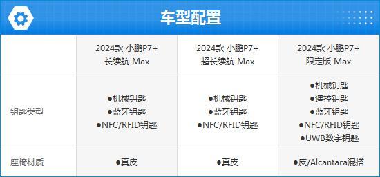 通过配置对比发现,2024 款小鹏 P7 虽然都配备了后置单电机,但是根据型号配置的不同,电机的功率校准也不同,并且对应两种容量电池组,CLTC 纯电续航里程分为 615km、725km 和 700km 三种。另外,配置上的差别很小,只有顶部版本增加了遥控钥匙和 UWB 用数字钥匙代替真皮座椅 /Alcantara 混搭材料。