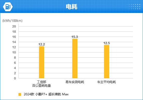 2024年,根据工业和信息化部的申报信息、各大汽车垂直媒体测试和车主测试数据, 款小鹏 P7 超长续航 Max 工业和信息化部用电量为 12.2kWh/100km,易车网站实测用电量为 15.3kWh,车主测量的平均电耗为 12.5kWh/100km(数据仅供参考)。