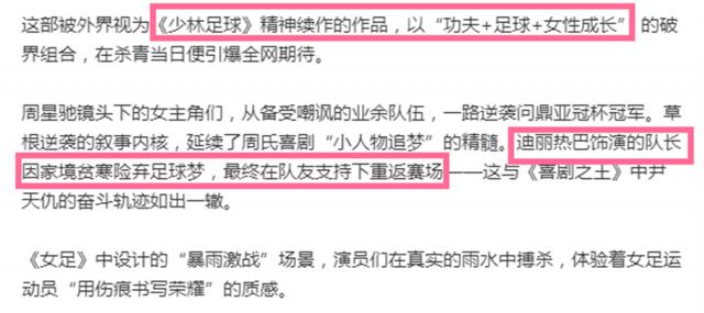 文中还提到,“周星驰镜头下的女主角,从被嘲讽的业余团队,一路反击夺得亚冠冠军。草根反击的叙事核心延续了周氏喜剧《小人物追梦》的精髓。迪丽热巴饰演的队长因为家庭贫困而抛弃了足球梦,最终在队友的支持下重返赛场——这和《喜剧之王》中尹天仇的战斗轨迹完全一样。”