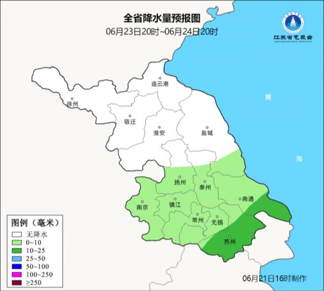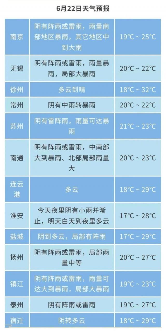 据 @江苏气候微博发布,6 月 22 日 08 时至 6 月 23 日 08 临江和苏南地区有阵雨或雷雨,其中苏南地区有大雨,部分地区有暴雨;其他地区多云到阴。今日最高气温:淮北北部地区 30~31 ℃,江淮南部和苏南地区 24 ℃左右,其他区域 28~29 ℃;清晨最低气温:淮北和苏南地区 20 ℃左右,其他区域 17~18 ℃。淮北地区偏西风,其他地区偏东风,风速:苏南地区 4-5 级阵风 6 等级,其他区域 3-4 等级,雷雨地区雷雨时短阵风。 7-8 级。