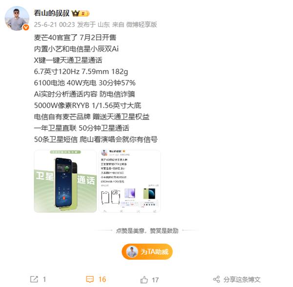 出炉中国电信麦芒40关键配备 全部天通卫星通讯 支持防电诈