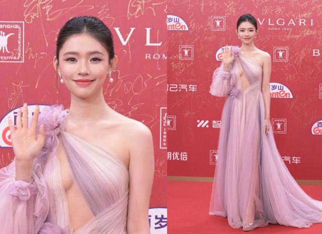 林允穿着一条浅紫色的斜肩纱裙,垂直的薄纱让她看起来充满了仙气。同时,因为裙子的皮肤暴露程度恰到好处,她顺便展现了一个好身材,展现了一种高级性感的美。