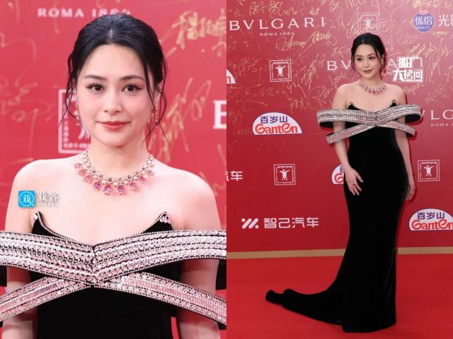 近年来,阿娇的身材一直在微胖和减肥之间重复。现在她真的瘦了,保持着饱满的面部和匀称的身材。所以穿这件带有立体钻石装饰的黑色筒顶连衣裙比苗条女明星更有效。