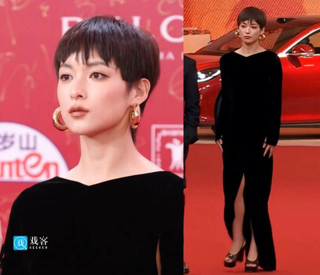 在等待上映的电影中扮演郭麒麟女友的孙安可,穿着一件前开叉的黑色天鹅绒连衣裙,留着短发和醒目的大耳环,散发着一个完整的冷艳。