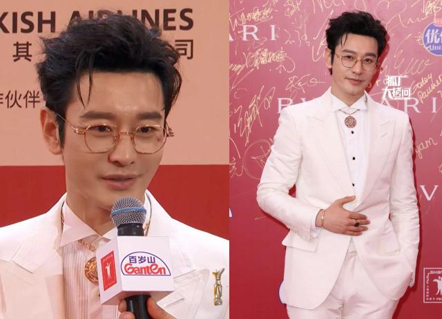 黄晓明在上一届电影节上获得了金爵奖最佳演员(即最佳男主角)。虽然他今年没有带作品走红毯,但他仍然被组织者任命为一带一路电影周推广大使。在闭幕式的红地毯上,他穿着一套白色西装,搭配金属框眼镜,帅气又年轻。如果非要找他造型上的不足,大概只有发际线了——太整齐了,像一条直线,看起来会不那么自然真实。