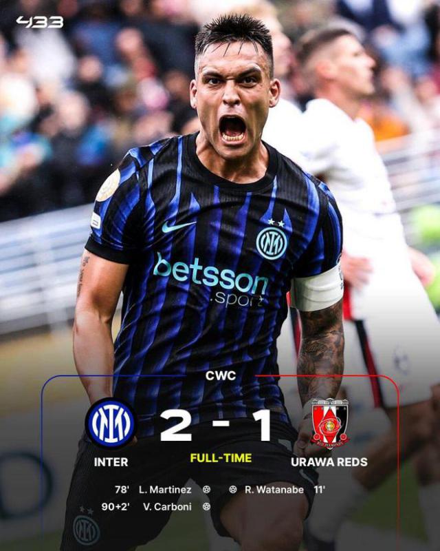 世界杯预选赛 E 组第 2 轮,国米 2-1 逆转浦和红钻,赢得第一场胜利,4场胜利, 亚冠冠军分居第一,两连败。渡边凌磨首开纪录,劳塔罗头球中框,但后半场侧勾扳平,卡博尼补时决杀。