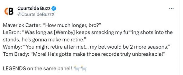 文班还搞笑地回应道:“你可能比我晚退役。”接着又正式回应:“我想可以再打两个赛季。”