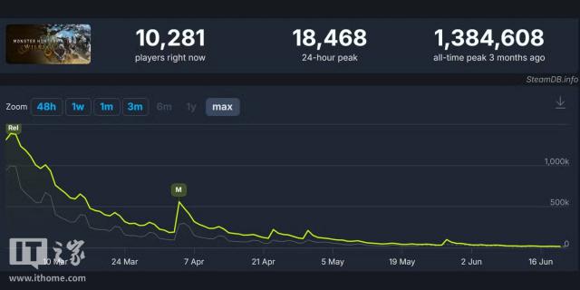 IT 世家 6 月 22 日消息,自 2 月 28 日本上线以来,卡普空旗下的动作角色扮演游戏《怪兽猎人:荒野》正在进行 Steam 该平台的热度急转直下。据 SteamDB 数据显示,截至 6 月 21 日,该游戏 24 在一小时内,最高同时在线人数仅为 18,468 人,与 2 月 25 日达到的 138 与万峰相比,玩家数量急剧下降。 98.67%。这款游戏除了玩家数量急剧下降外,最近还遭遇了大规模的差评轰炸。