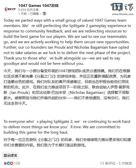 IT 世家人注意到,在领英的一篇帖子中,1047 Games 这次裁员涉及到“一小部分”员工,目的是将资源集中在为玩家创造“最佳游戏体验”上。这个工作室强调,他们仍然根据社区反馈“完善”“分裂门” 2》 游戏体验。另外,工作室的创始人伊恩・普鲁勒(Ian Proulx)和尼古拉斯・巴加米安(Nicholas Bagamian)为了支持游戏进入下一阶段的发展,决定放弃工资。对裁员工而言,1047 Games 承诺帮助他们找到新的工作机会,并指出公司对 《分裂之门 2》 长期承诺,表示正在打造一款“长期运营”的服务游戏。