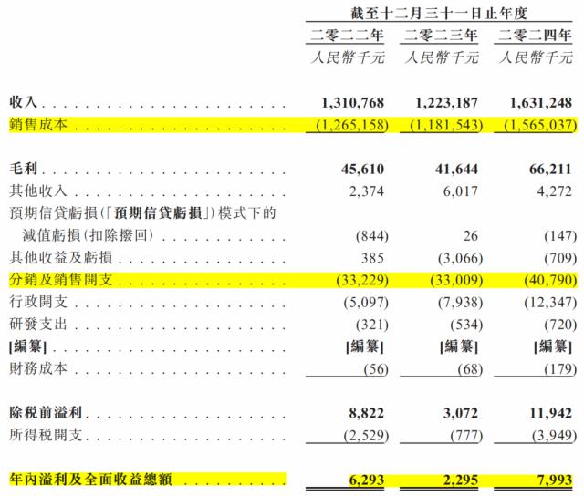 2022 年 -2024 年(简称:报告期),快驴科技的营业收入分别为: 13.11 亿元、12.23 亿元、16.31 相应的毛利率分别为亿元。 3.5%、3.4%、4.1%;纯利润 629.3 万元、229.5 万元、799.3 一万元;净利润低至 0.5%、0.2%、0.5%,2024 年度也出现了严重的起伏。除销售成本外,分销和销售费用也成为影响利润的主要因素。
