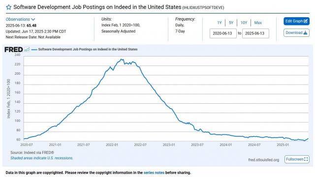 一是市场上的相关岗位越来越少了,根据 Indeed 的数据,自 2020 年 2 到目前为止,软件开发岗位的招聘信息已经减少 30% 上面,放一张图片让大家看得更直观一些: