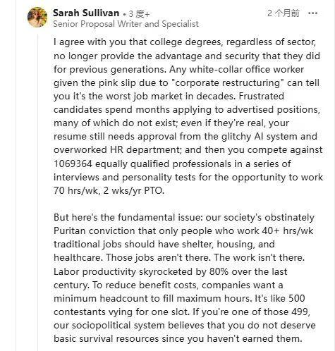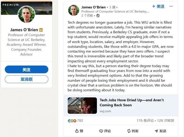 在 UC Berkeley 计算机教授 James O'Brien 在这篇帖子下,也有不少人说:“现在美国的就业环境,算得上是几十年来最糟糕的阶段。”