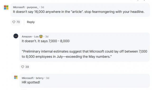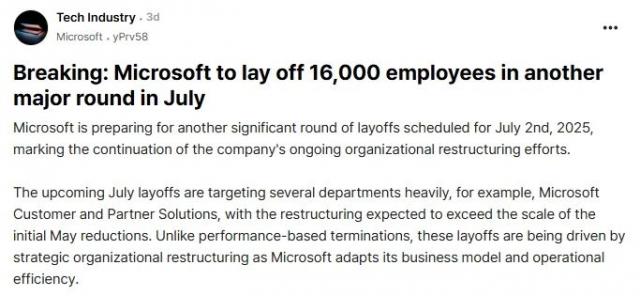 不过,根据评论区客户的提示,虽然这次裁员的规模肯定大于 5 月份,但是也没有 16,000 人们如此夸张:"一般内部估计显示,微软可能在 7 月份裁员 7,000 至 8,000 人"。
