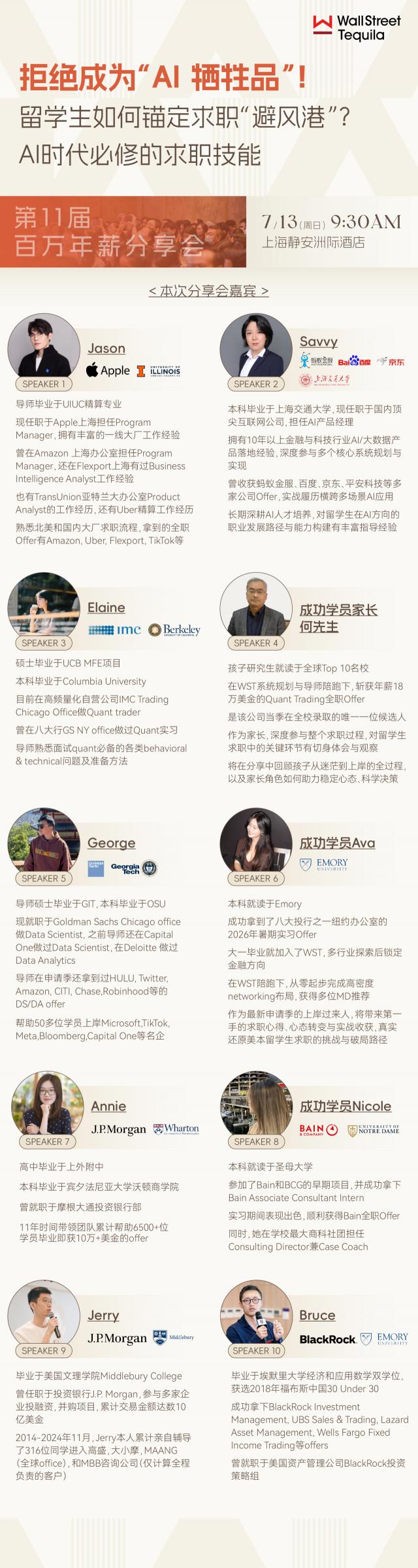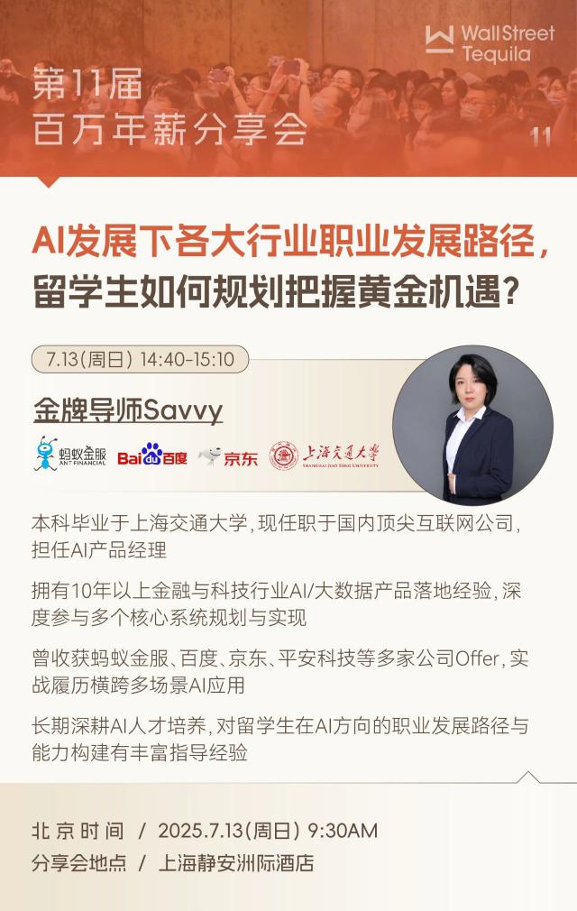 AI 时过境迁,怎样提升自己的不可替代性?假如你也有这样的疑问,北京时间 7 月 13 日,WST 第一次将在商家静安举行 11 届时将有百万年薪交流会,届时将有拥有。 10 金融科技行业年以上金融科技行业 AI/ 有大数据产品落地经验的导师将与您分享。 AI 发展之下,各大产业的职业发展路径 ~