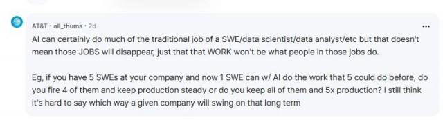 即使 AI 完全可以承担软件工程师的责任 / 数据科学家 / 其它职位的部分工作,如数据分析师,这并不意味着这些工作会消失。,仅仅意味着从事这些工作的人的工作内容将不再局限于这些传统任务。